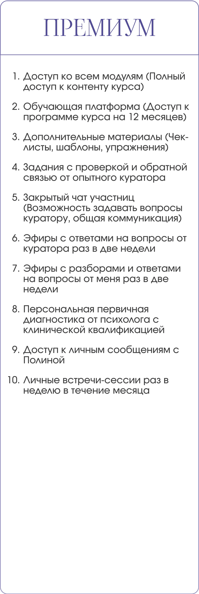 Персональные встречи-сессии со мной каждую неделю в течение месяца (только на тарифе Премиум)